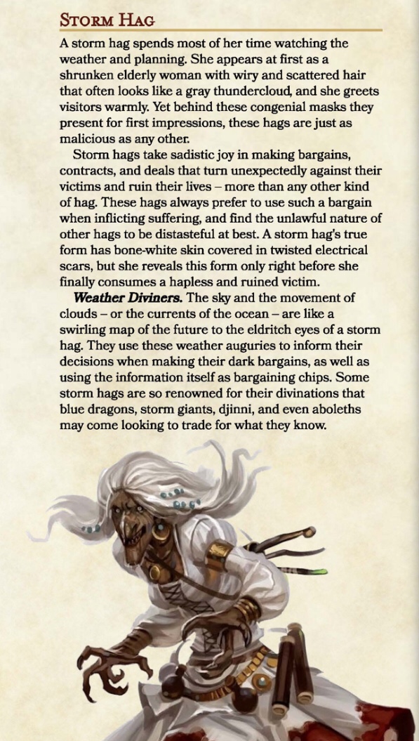 When the clouds turn gray and the winds pick up into a howl, wise travelers pray that the cause is only a natural tempest and the foul weather is not connected with a storm hag. Storm hags are hateful creatures, and strangely, their hate is one of the few things that brings them pleasure.